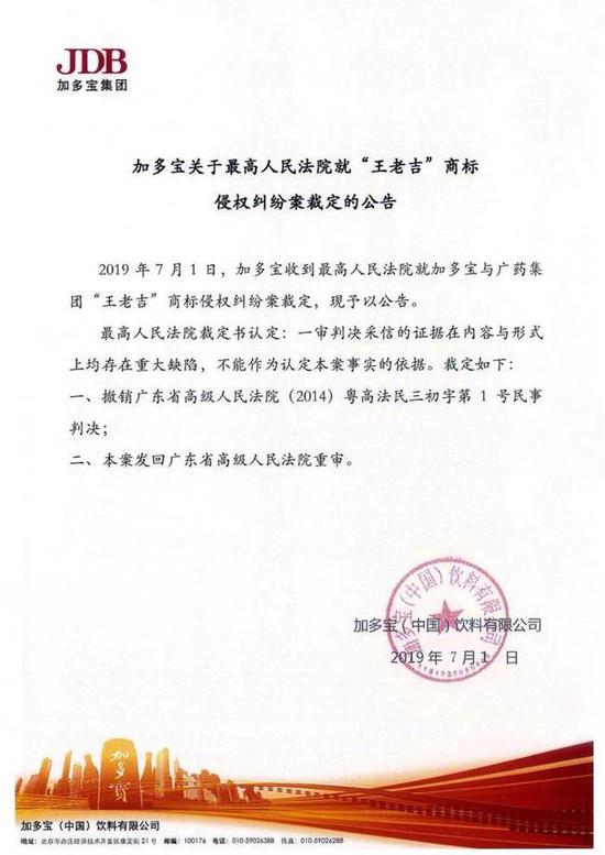 近日,“王老吉”商標侵權糾紛案“大戰三百回合”又獲最新進展。7月1日晚間,加多寶(中國)飲料有限公司通過自媒體平臺發布公告稱,2019年7月1日,加多寶收到最高人民法院就加多寶與廣藥集團“王老吉”商標侵權糾紛案裁定。