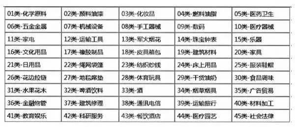 《商標(biāo)注冊(cè)用商品和服務(wù)國際分類》(尼斯分類)將商品和服務(wù)分成45個(gè)大類,其中商品為1~34類,服務(wù)為35~45類。
