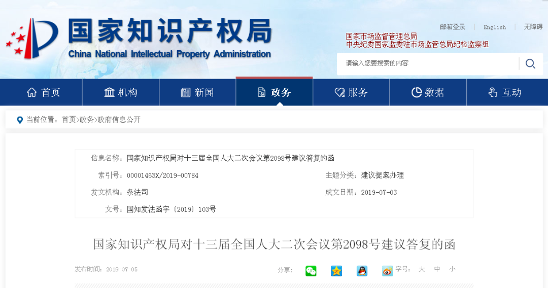 國家知識產權局對十三屆全國人大二次會議第2098號建議答復的函