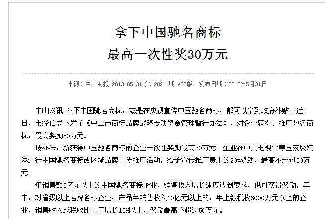 中山網訊 拿下中國馳名商標,或是在央視宣傳中國馳名商標,都可以拿到政府補貼。近日,市經信局下發了《中山市商標品牌戰略專項資金管理暫行辦法》,對企業獲得、推廣馳名商標,最高獎勵50萬元。