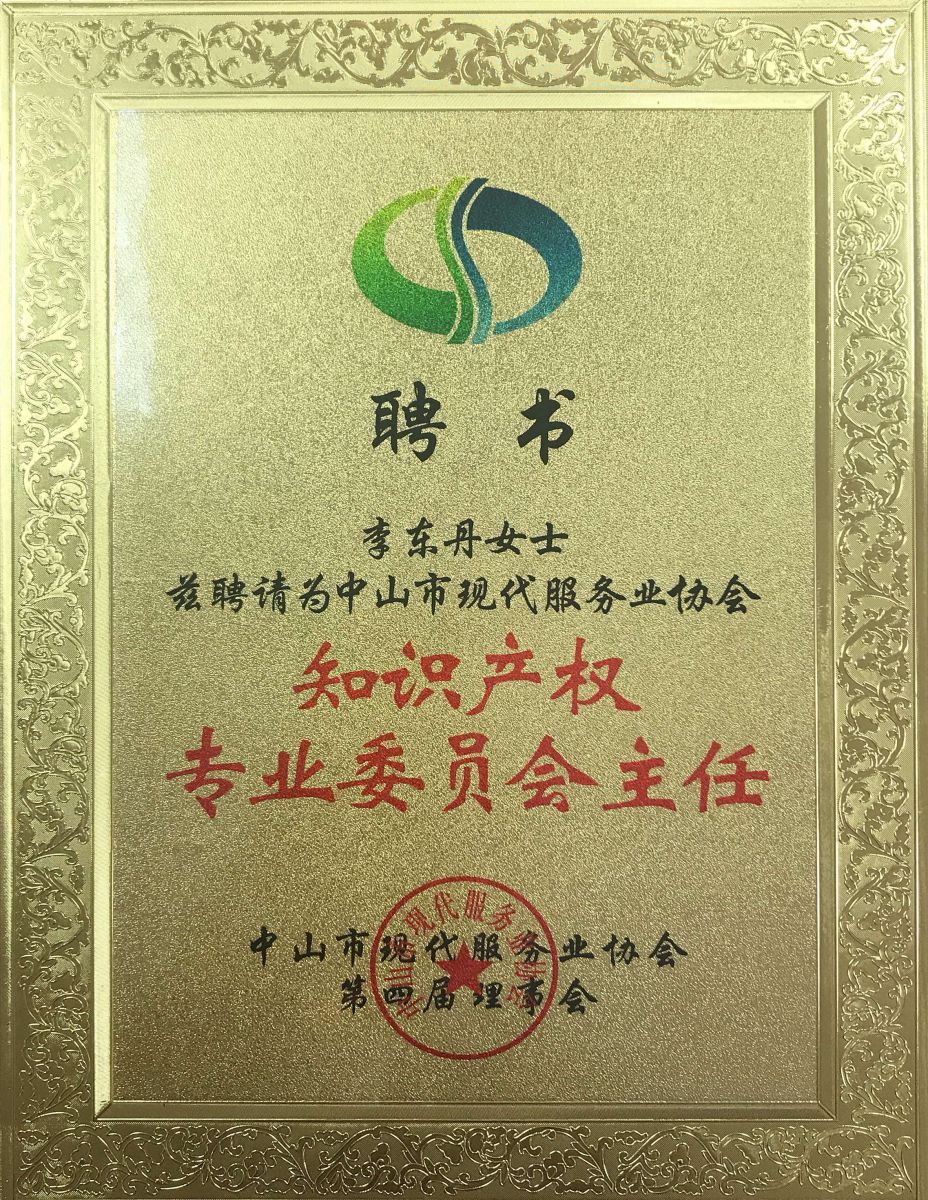 我司總經(jīng)理李東丹女士為中山市現(xiàn)代服務業(yè)協(xié)會知識產權專業(yè)委員會主任
